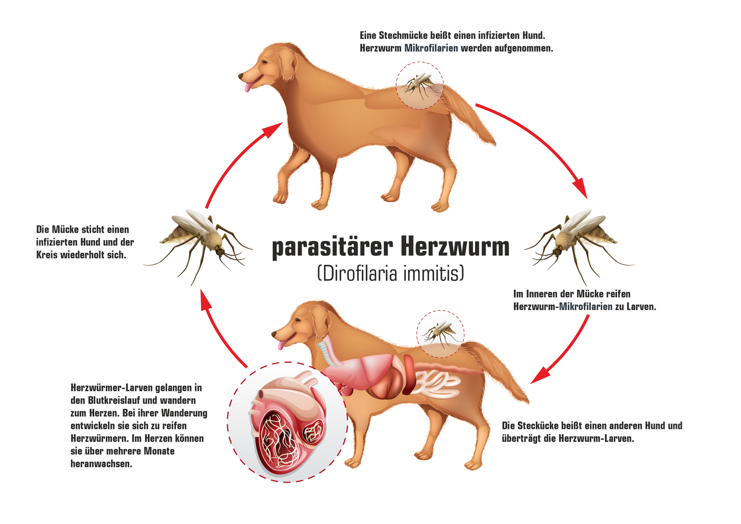Die Stechmücken können den Parasiten von Tier zu Tier, aber auch auf Menschen übertragen. Wobei der Mensch ein Fehlwirt ist. Die bis zu 30 cm langen Herzwürmer besiedeln innere Organe des Wirtes (z.B. Hund). Hier bilden Sie Mikrofilarien, welche in den Blutkreislauf gelangen. Stechmücken nehmen diese durch die Blutmahlzeit auf. In den Mücken entwickeln sich die Mikrofilarien zu Larven weiter. Diese werden dann beim Stich eines weiteren Tieres oder Menschen übertragen. Achtung! Die übliche heimische Wurmkur schützt nicht vor Herzwürmern.