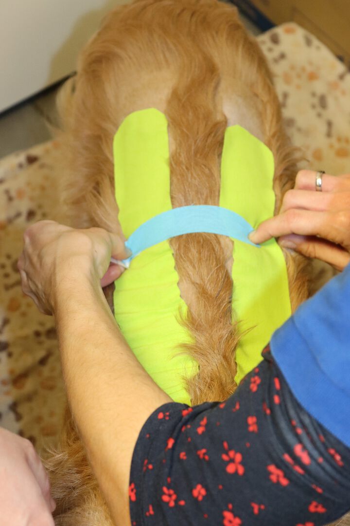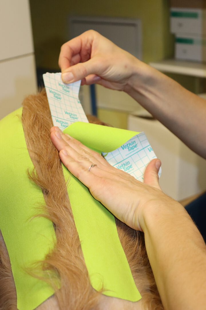 Das vom japanischen Chiropraktiker Kenzo Kase entwickelte Kinesiotaping wird nicht nur an Menschen, sondern auch an Tieren angewandt. Das Tape wird auf die Haut oder direkt auf das Fell geklebt. Durch das Abheben der Haare kommt es zur Ver-schiebung der Hautebenen. Dies nimmt positiven Einfluss auf den Heilungsprozess. Feine Nervenenden und Rezeptoren werden leicht aktiviert und der Raum für den Blut- und Lymphkreislauf wird vergrößert.