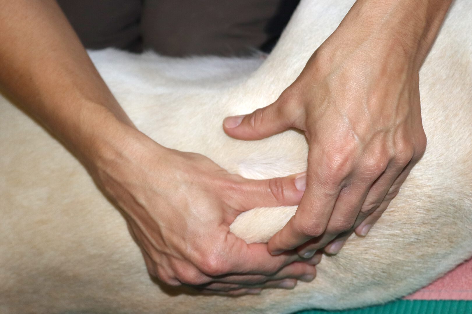 Dieser Griff ist anwendbar bei den Extremitäten der Hunde. Einzelne Muskeln werden mit den Fingern isoliert und hin und her gerollt. Muskeln können so gezielt massiert werden - Dehnungszustand und Durchblutung werden auf eine äußerst wirkungsvolle Art beeinflusst.