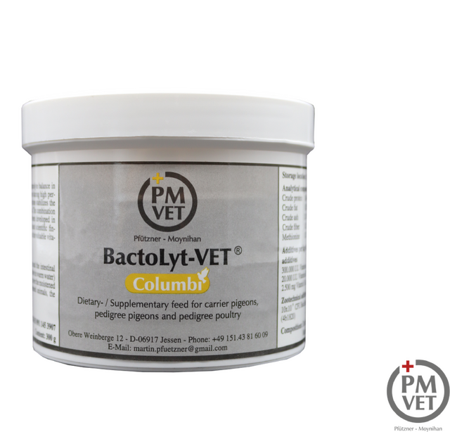 Ursprünglich entworfen als Diätfuttermittel zur Unterstützung während der “Jungtierkrankheit” (JTK) der Taube, findet es inzwischen weitaus mehr Anwendungsindikationen. Die Kombination aus Elektrolyten, Probiotikum und Vitamin A, D und E kann unterstützend bei jeder Durchfallerkrankung, nach jeder Antibiotika Therapie, sowie bei erhöhter sportlicher Aktivität eingesetzt werden. In diesen Fällen wird der gestörte Elektrolythaushalt, durch BactoLyt-VET® Columbi wieder hergestellt. Das Probiotikum, Bacillus subtilis unterstützt eine gesunde Verdauung und wirkt durch natürliche Nahrungskonkurrenz gegen negative Bakterien wie z.B. E.coli. Die Vitamine A, D und E sind wichtig für eine Vielzahl von Entwicklungsstadien der Vögel, den normalen Stoffwechsel und die allgemeine Gesundheit.