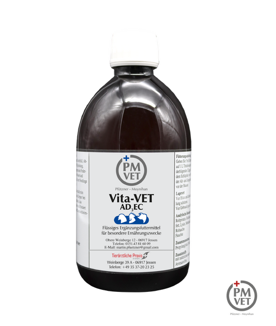 Vita-VET AD3EC ist ein flüssiges Ergänzungsfuttermittel für besondere Ernährungszwecke zum Ausgleich bei Malabsorption bei Vögeln und zur Unterstützung der Reproduktion bei Säugetieren.